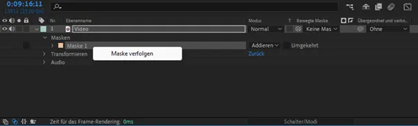 Jetzt aktivieren wir die Bewegungsverfolgung für unsere Maske: Im Bedienfenster Zeitleiste machen wir einen Rechtsklick auf den Eintrag Maske 1 auf unserer Ebene und wählen Maske verfolgen.