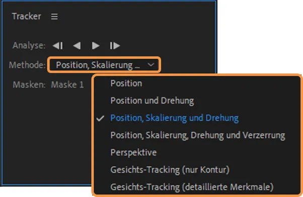 Das Bedienfenster Tracker wird automatisch geöffnet. Im Bedienfenster Tracker bei Bedarf die Optionen Position, Skalierung und Drehung aktivieren.