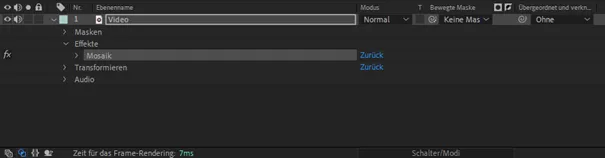 Wir sehen nun im Bedienfenster Zeitleiste automatisch in den Ebenenparametern den neuen Eintrag, um die weiteren Einstellungen vorzunehmen. Alternativ lässt sich der Effekt im Bedienfenster Effekteinstellungen bearbeiten, solange die Ebene ausgewählt ist.