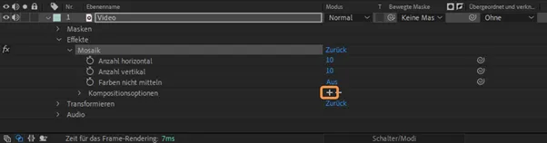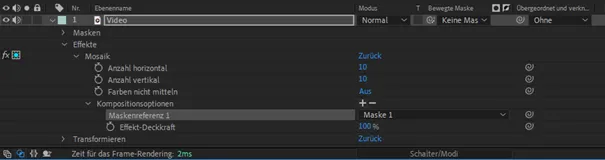 Ebenenparameter der Effekte aufklappen und unter Kompositionsoptionen mit der Schaltfläche + die Maske auf den Effekt anwenden.