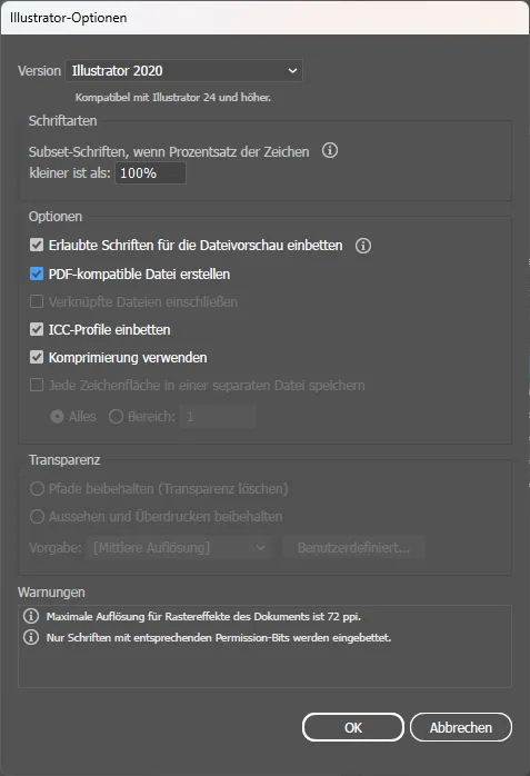 Als Voraussetzung muss die Illustrator-Datei zuvor mit der Einstellung PDF-kompatible Datei erstellen gespeichert worden sein, da InDesign dann auf die darin eingebette PDF zurückgreift. Und am besten sollten natürlich wie immer die Schriften eingebettet sein: