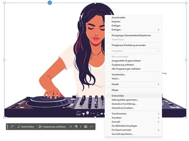 Unsere Grafik sollte dazu gruppiert sein. Wir klicken in der Symbolleiste oder nach einem Rechtsklick ins Bild auf Drehscheibe und der Spaß geht los.