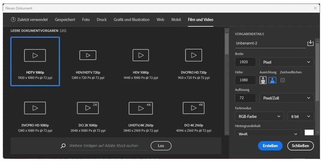 In Photoshop legen wir unser Dokument am besten gleich im entsprechenden Film- bzw. Videoformat an.