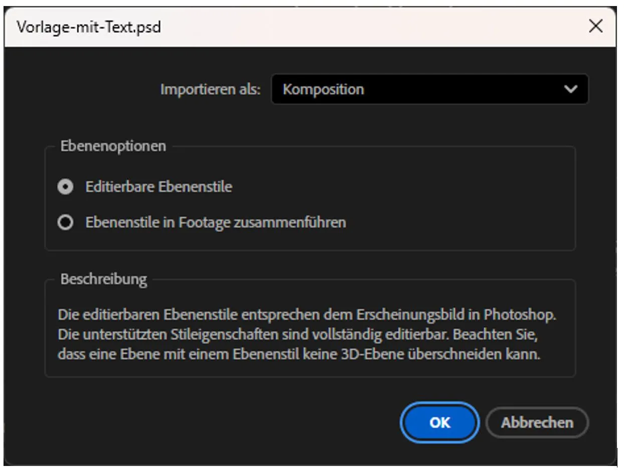 Beim Import von Dateien mit mehreren Ebenen in After Effects werden wir nach der Import-Methode gefragt und wählen Importieren als: Komposition.