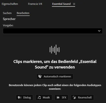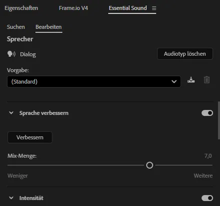 Sobald wir das Tag Dialog zugewiesen haben, sehen wir diese Eigenschaft im Bedienfenster Essential Sound unter Bearbeiten und es erscheinen nun zahlreiche praktische Bearbeitungsmöglichkeiten der Audioqualität.