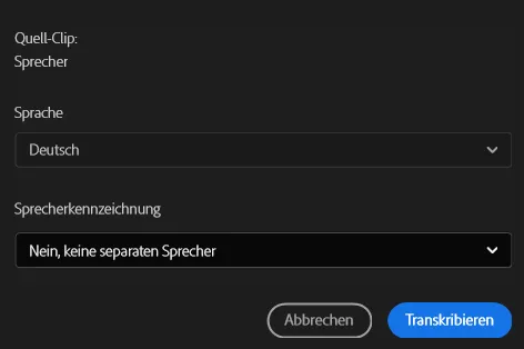 Es folgen noch ein paar praktische Einstellungsmöglichkeiten, bevor es los geht: Natürlich sollten wir hier die richtige Sprache auswählen, damit die Erkennung gut funktioniert. Und unter Audioanalyse bestimmen wir, dass alle Clips mit der Eigenschaft Dialog bearbeitet werden sollen. Sehr nützlich bei mehreren Personen ist die Option Specherkennzeichnung, denn hiermit lassen sich unterschiedliche Sprechende getrennt erfassen.
