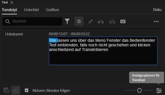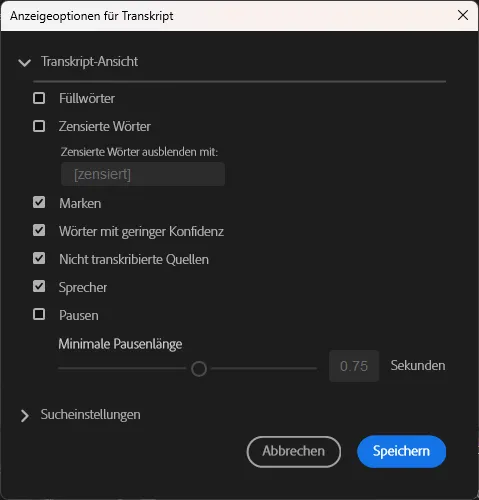 Hinter der Schaltfläche Anzeigeoptionen für Transkript unten rechts verbergen sich noch praktische Optionen bezüglich lästiger Füllwörter oder zensierter Wörter.