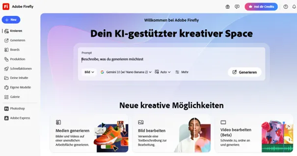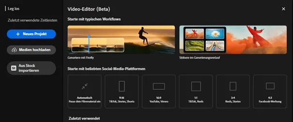 Mit etwas Vorkenntnissen in irgendeinem Videoschnittprogramm, zum Beispiel Premiere Pro, findet ihr euch schnell in die Oberfläche ein. Zunächst aber schnappt ihr euch den Browser Chrome und logged euch in euren Firefly Account ein. Die Funktion Video bearbeiten findet ihr über das Menü Kreieren. Dieser Videoeditor ist noch relativ neu und daher noch in der Beta-Version, die bisher nur in Chrome funktioniert.