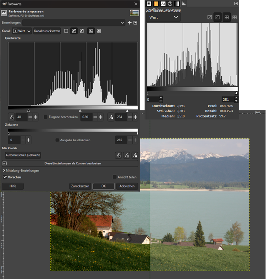 - Die Änderungen übernehmen wir mit OK. (Alternativ könnten wir die Einstellungen direkt in das Fenster Farbkurven übernehmen, um eine gezielte Kontrastbearbeitung vorzunehmen.)