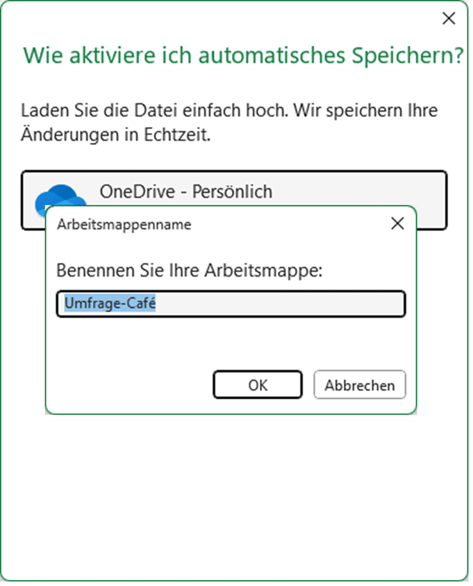 Vorbereitung: Wir legen ein neues Dokument an, in dem später automatisch die Antworten erfasst werden sollen. Hierfür müssen wir oben links im Programmfenster Automatisches Speichern aktivieren, um unser Dokument in die Cloud hochladen.