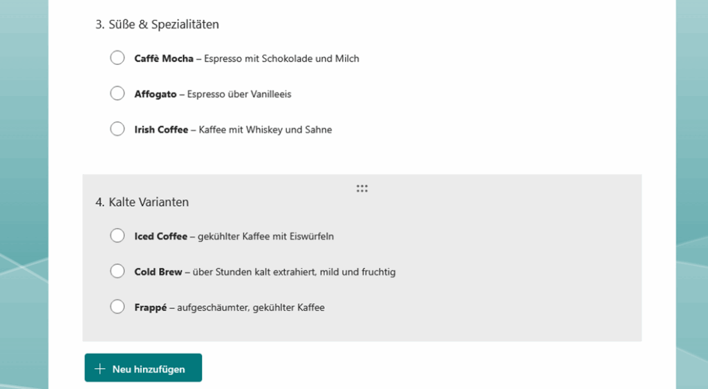 In unserem Beispiel beginnen wir mit der Schaltfläche Auswahl und geben anschließend einige Fragen ein.